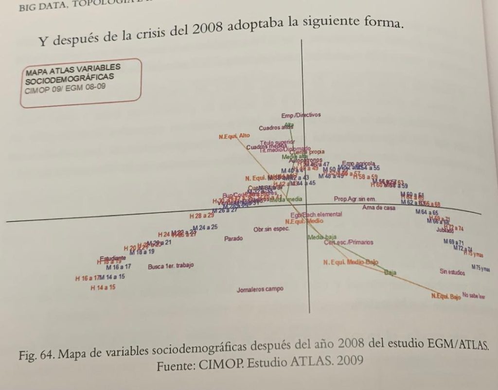 A principios de los noventa, cuando yo ya estaba en el lado publicitario del mercado, en Central Media, le pedí ayuda para buscar algún estudio diferencial, que nos ayudara a ofrecer productos e ideas diferentes a nuestros clientes. De ahí surgió Atlas, un estudio que mantuvimos a lo largo de más de veinte años. Atlas era una reelaboración del EGM (Estudio General de Medios) mediante diferentes análisis multivariantes, en especial el AFCM (Análisis Factorial de Correspondencias Múltiples), que nos permitía ver y analizar la evolución de la sociedad española, de sus equipamientos y consumos de medios y productos a lo largo de todos esos años en los que se realizó el estudio. En la última época del estudio, en años alternos, se analizaba el estudio AIMC Marcas.