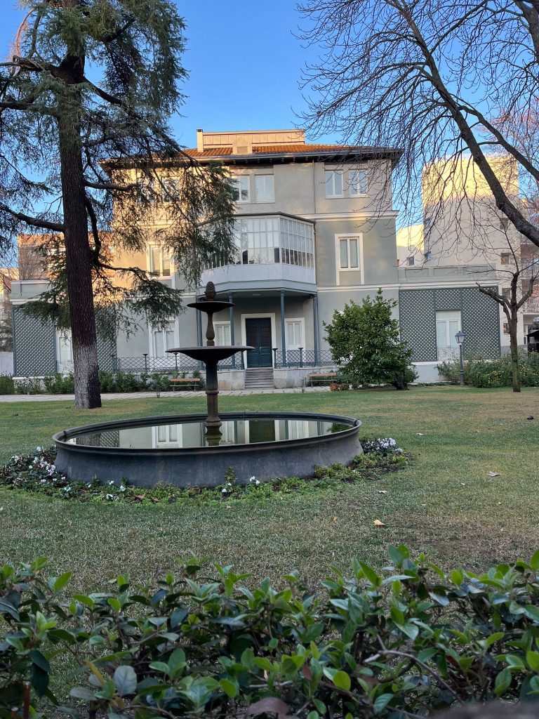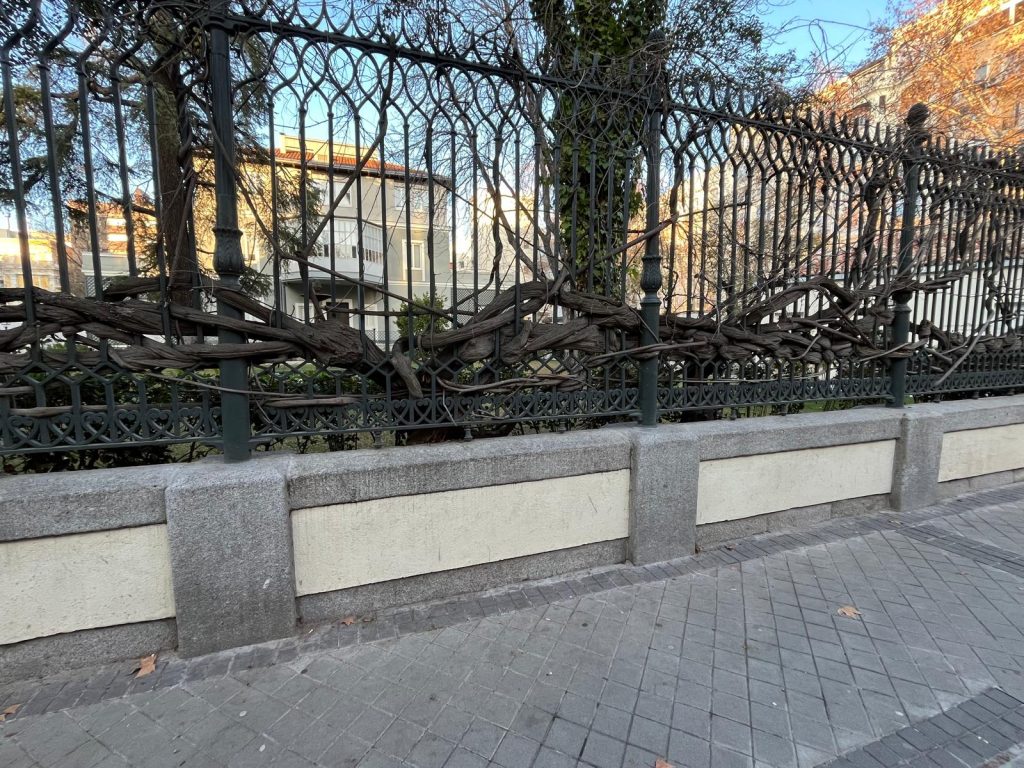 No sólo el edificio es singular; también lo es la verja que da a la calle de Fortuny. El paseo en el que hice las fotos lo hice en invierno y en la foto se pueden apreciar los gruesos troncos abrazados a los hierros de la verja. Pero el mejor momento para verlo es la primavera; los troncos son de glicinias y merece ver el estallido de color violeta de los racimos de esas flores que se produce en esa época.